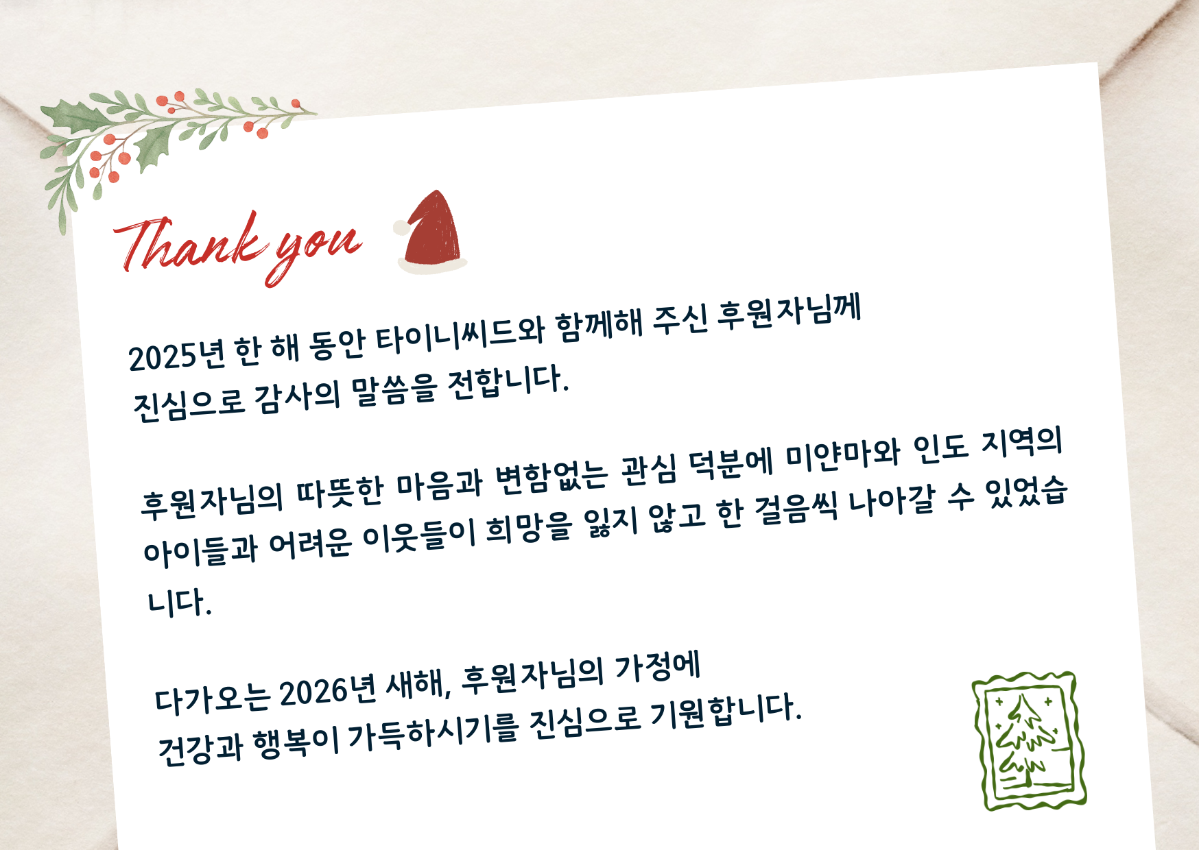 한 해의 마지막, 어려운 이웃의 산타가 되어주신 후원자님께 깊은 감사의 말씀을 전합니다. |