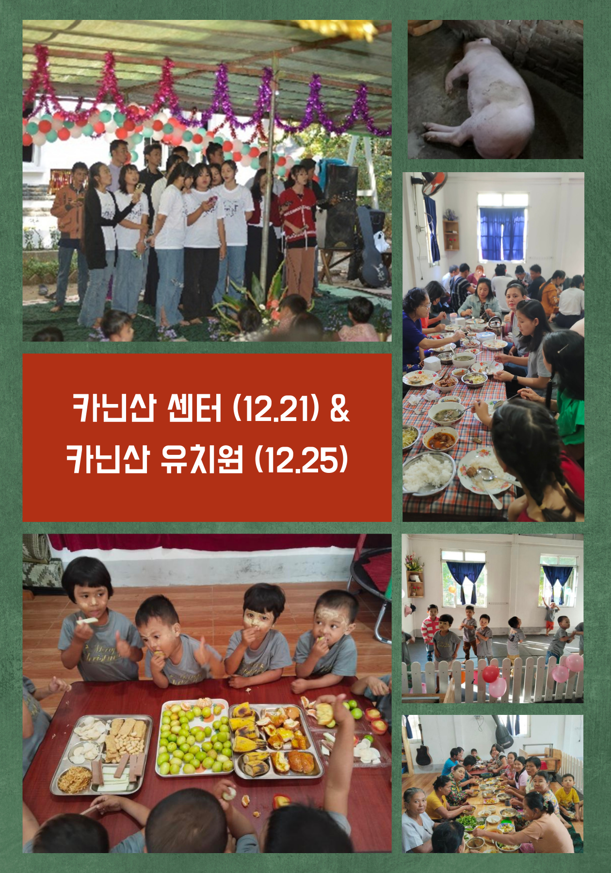 12월 25일에는 카닌산 유치원에서 부모님을 초대한 크리스마스 행사가 이어졌습니다. 아이들이 준비한 공연을 보고, 간식을 나누고, 함께 식사를 했습니다. 아이들은 먼 한국에서 산타 할아버지가 보내준 선물을 받아들고 환하게 웃었습니다. |