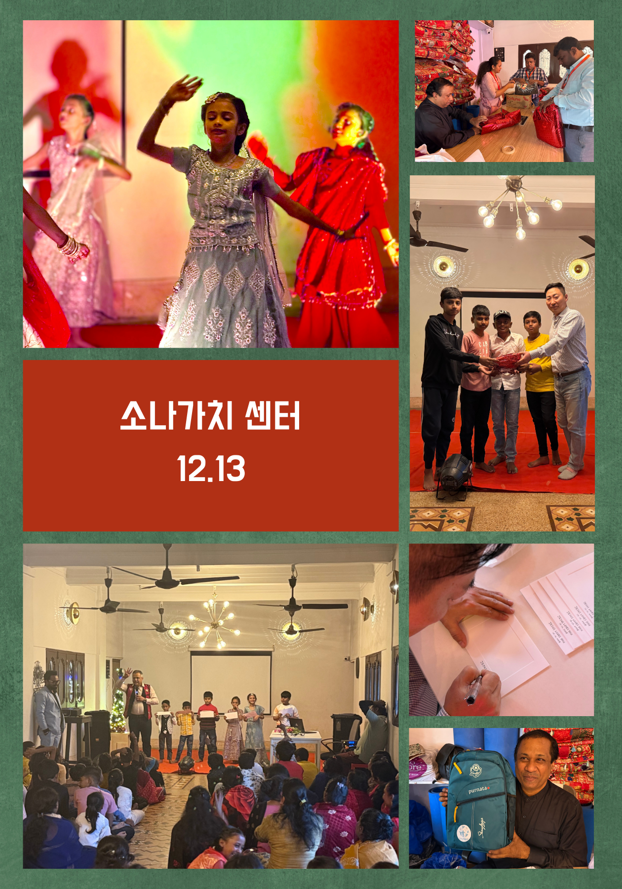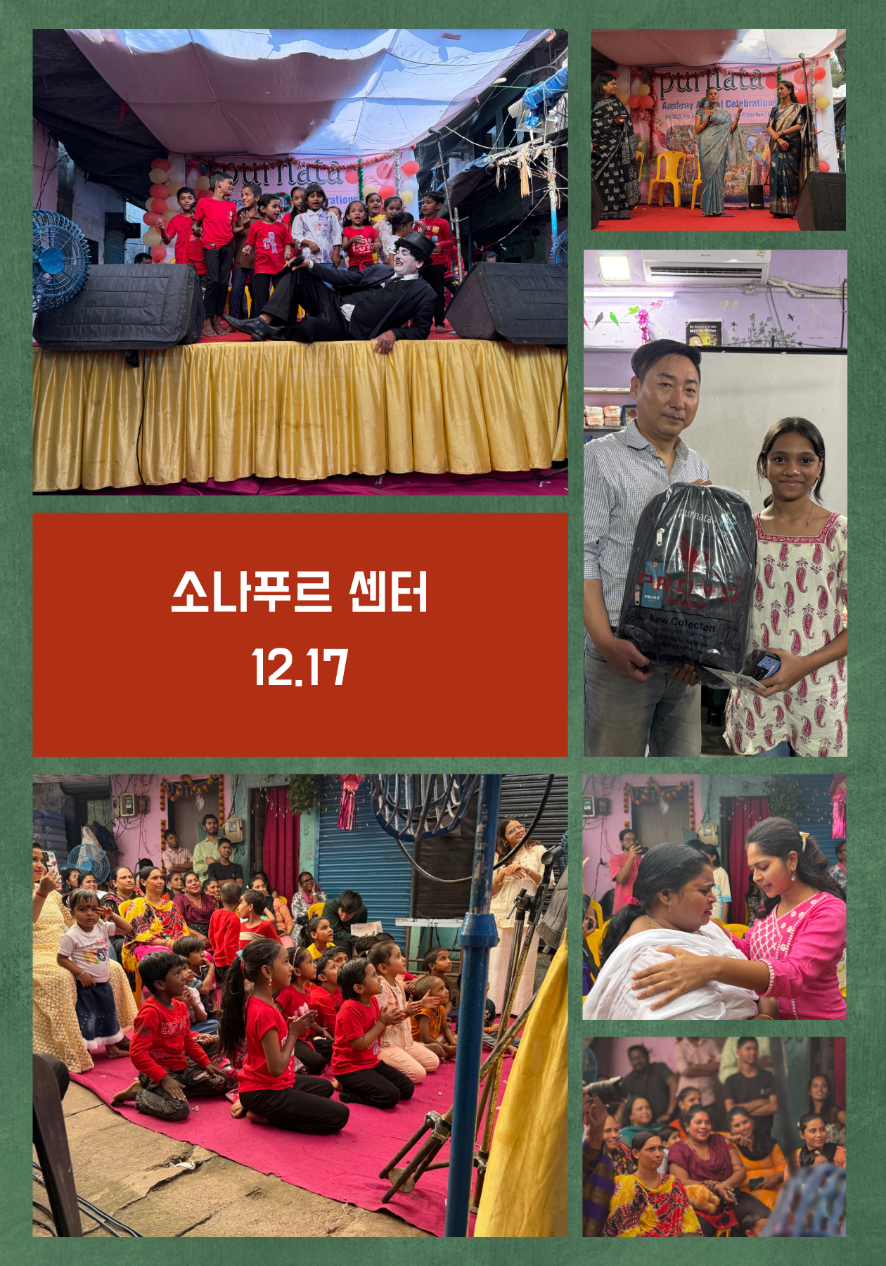 12월 17일, 소나푸르 센터에서 크리스마스 행사가 진행되었습니다. 소나푸르 센터는 뭄바이의 홍등가 지역에 위치해 있습니다. 이번 크리스마스 행사는 홍등가 거리 사이의 조금 넓은 골목길을 행사 장소로 정했습니다. 무대에서는 캐럴과 춤, 마술쇼 등 다양한 공연이 펼쳐졌습니다.